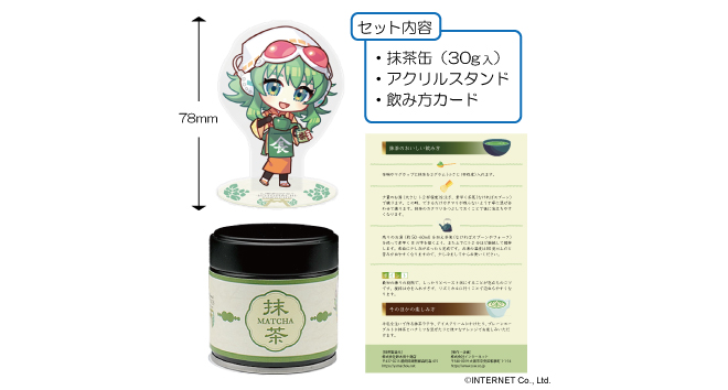 ヤマチョウが厳選した奥深い抹茶の風味をお楽しみいただけます。 アクスタは抹茶缶の蓋のサイズにピッタリ。 抹茶缶には、それぞれのキャラクターをプリントしたオリジナルラベルを使用。 初めて抹茶を飲まれる方にも安心してお楽しみいただける「抹茶のおいしい飲み方」カード付き。 【セット内容】 ・抹茶缶(30g入)×1缶 ・アクリルスタンド×1体 ・飲み方カード×1枚 (C)INTERNET Co., Ltd.